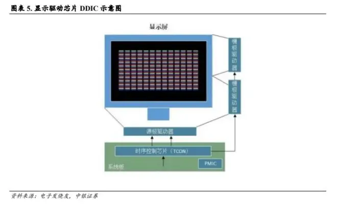 一套完整的显示驱动解决方案一般由栅极驱动器、源极驱动器、时序控制芯片、显示器电源管理芯片(PMIC)组成。栅极驱动器和源极驱动器统称为显示驱动芯片。