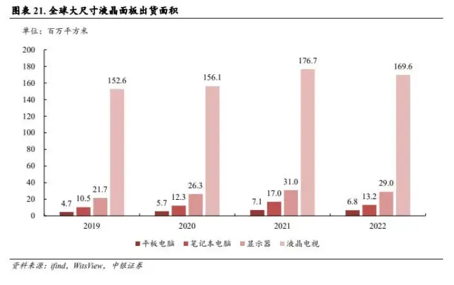 全球大尺寸液晶面板产品以电视为主。根据 WitsView 数据,2022 年全球液晶电视面板出货面积约1.70 亿平方米,约占大尺寸液晶面板出货面积的 77.6%;2022 年全球液晶显示器面板出货面积约2,900 万平方米,约占大尺寸液晶面板出货面积的 13.3%;2022 年全球液晶笔记本电脑面板和液晶平板电脑面板出货面积约 1,320 和 680 万平方米,占大尺寸液晶面板出货面积不足 10%。