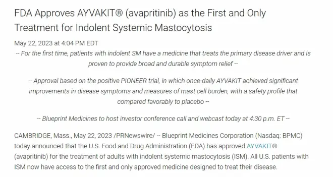 2023年5月22日,Blueprint Medicines宣布,美国食品药品监督管理局(FDA)已批准泰吉华®(阿伐替尼片)用于治疗惰性系统性肥大细胞增多症(ISM)成人患者,该产品也是ISM领域首款疗法。