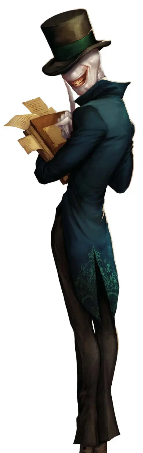 玄秘使者有时会佩戴着微笑的面具,但在微笑之下,是它因痛苦而扭曲的脸。它是为永生魔而制作的偶像,是一个神奇的玩偶,是噩梦镇原生生命的孪生兄弟,充满了奇怪而邪恶的荣耀。它感受到了永生魔的分裂和愤怒,因为他们的统治已被蚕食。