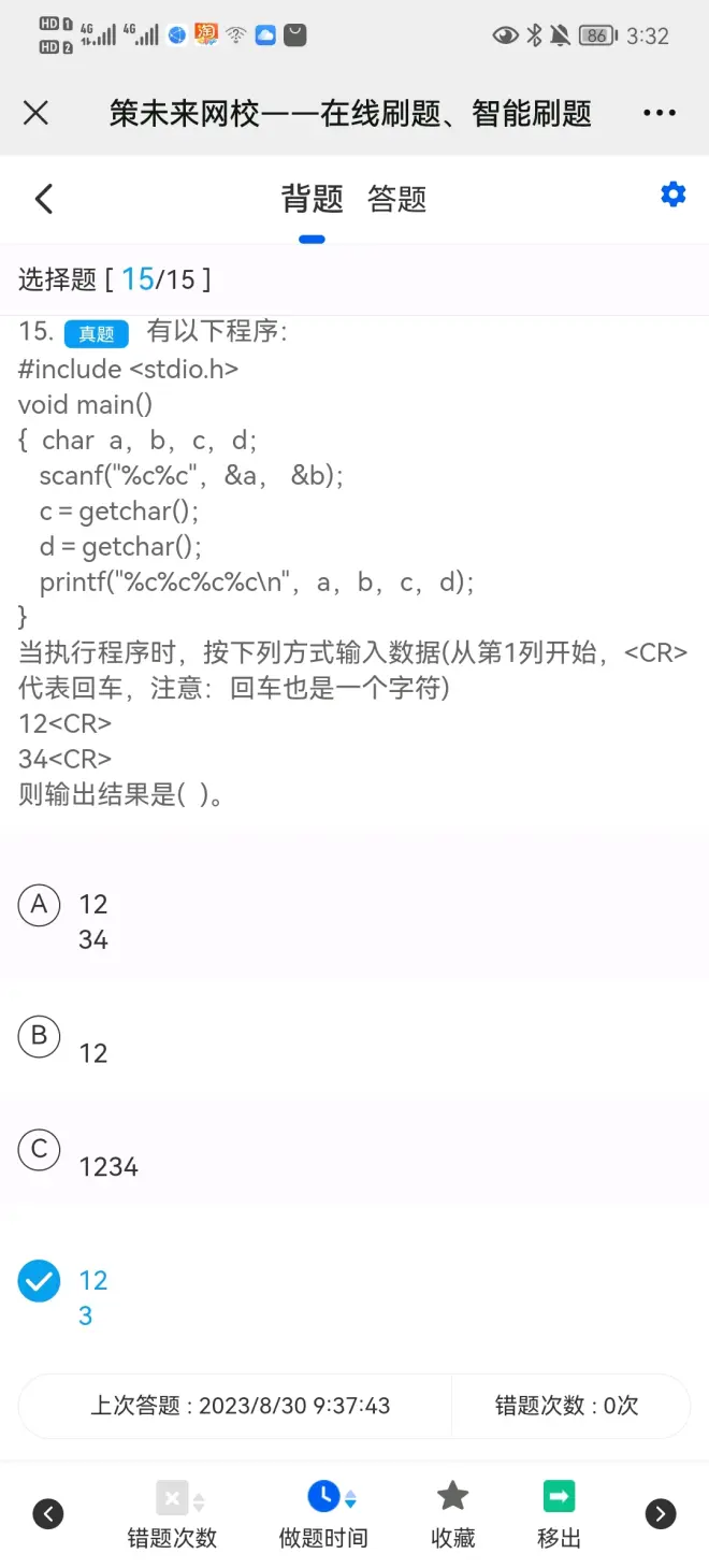 getchar()就是获取键盘输入缓冲区的一个字符 本题因为有百分号c限制且两个百分号c直接并无空格 所以a被赋值1 b被赋值2 剩下暂时没有用所以进入缓冲区 回车也就是换行字符给了c 3给了d 所以答案为D 十一,结构体的 -> 指针 这题表示生成一个结构体STD类的数组和指向这个结构体变量的指针星ps