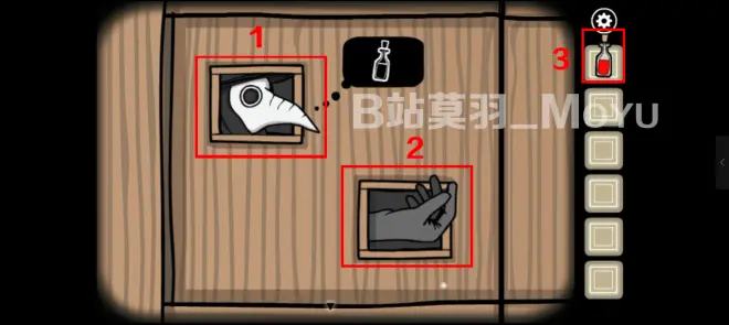 根据面具人给的线索前往森林小屋调药水,桌上的纸有提示,按照顺序倒入液体,从下往上绿白黄绿白红。