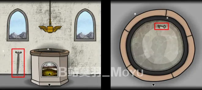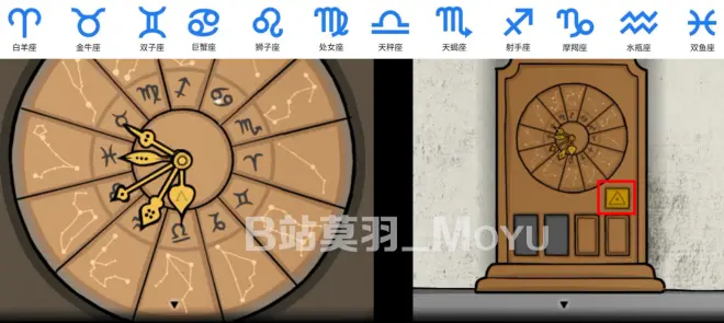 爬上梯子来到三楼,移动蜡烛看墙上的影子,完全重合后获得星座线索,大象是天秤座,鸟是双鱼座,猫头鹰是巨蟹座,鸭子是射手座,鹿是摩羯座,输入得到的星座线索获得铜钥匙。