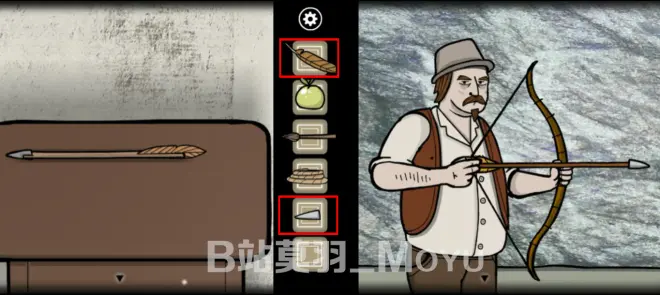 来二楼,把尖的骨头和羽毛跟桌子上的木棍组合在一起获得一支箭,把组合好的箭拿给一楼的叔叔。