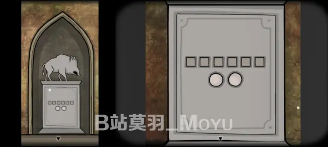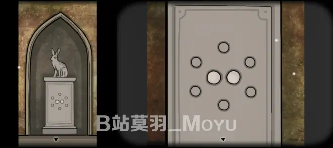 门后有五个雕像,每个雕像都有一个谜题,兔子雕像点击中间两个圆点,左右轮流点就能解开谜题,拿到兔子面具。