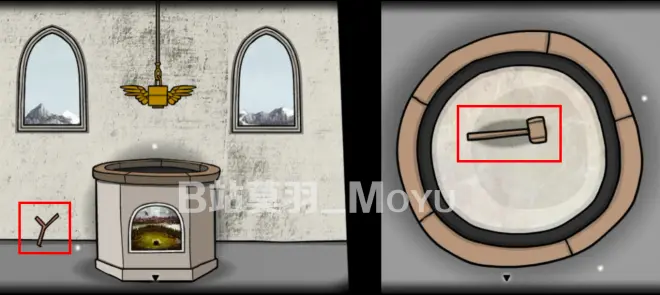 来到湖边小屋,左下角拿到一根树枝,水井中拿到一把锤子。