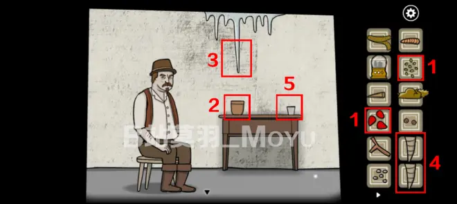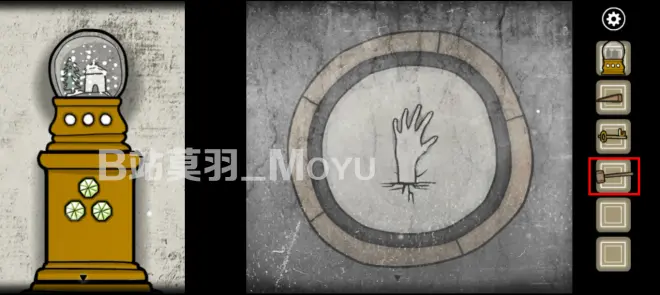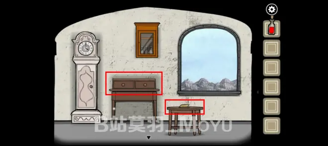 点击桌子上的装置,按照提示调整图案。最长的杆是旋转角度,中长的杆调整盈缺,最短的是调整颜色。一共五轮,过关后窗外的月亮变成血月。