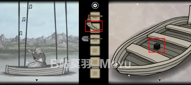 来到湖边把号角递给奶奶,疯狂点鼠标让她吹号角,吸引大蝗虫把奶奶带走,从船上拿到黑方块放进湖边建筑黄盒子里。