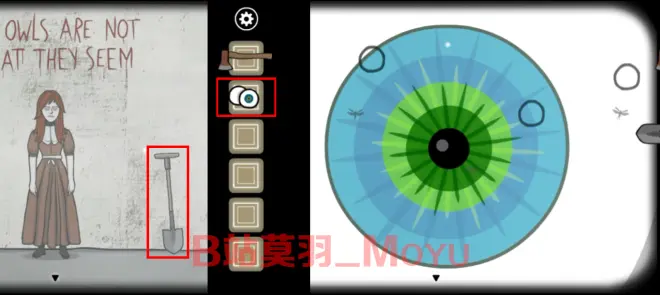 继续前进,来到森林小屋,拿到一把铲子,把羊眼睛给妹妹,点她的右眼,玩个小游戏,移动森林小屋门口的三只虫,使之刚好能在右眼三个小圆圈里,在外面移动再进来看眼睛调整位置。