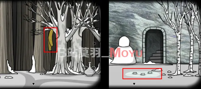 前往树木小屋的路上捡到一条围巾,在树木小屋里玩一个推冰块的解谜游戏。