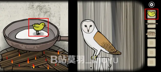 从妹妹手上拿走蜡烛,进入森林小屋,墙上挂着的画和红色猫头鹰是提示,用蜡烛点燃柴火,鸡蛋丢进锅里。
