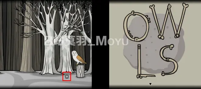 猫头鹰吃完以后吐出一堆鸡骨头,按照提示拼出OWLS,看骨头上刻着的很小的提示,对照下面那坨灰色的土上面的图案就能拼出来。