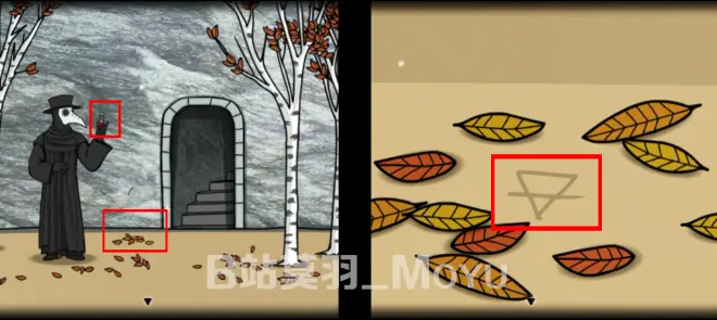 前往树木小屋,从面具人手里拿回血液,点他脚边的树叶,移开树叶后点地上的符号解锁成就