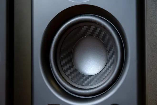 漫步者MR4的单元配置也比较不错,其中4英寸的中低音单元采用了聚丙烯纸盆搭配MICA振膜的设计,与常见的纯聚丙烯纸盆单元相比,MICA振膜的加入能够提升低频量感以及下潜深度,并且看上去也十分的个性与独特。