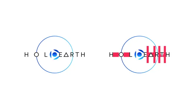 同样字形没问题,但是不合理的字间距降低了字形组合的识别度,“Holo”的最后一个“O”以图形为字符,但是图形不能立马联系到字母“O”,所以有点不明所以。后面“Earth”的五个拉丁字符,以三角形代替大写“A”,但也是用的标准几何的等边三角形,占用空间就已经大于其他字符。虽然每个字符的间距的相等的,但是没有视觉优化就会导致“A”和“T”旁边字符的间距从视觉上显示得更宽,“A”和“R”,“R”和“T”,“T”和“H”的kerning都很明显不平衡。