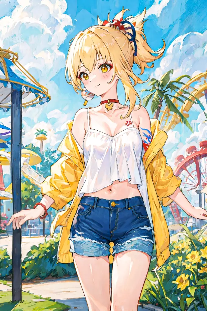 最后宵宫学姐讲完先走了,换了个乏味的老师说了些没什么营养的东西,这才放我们离开。我和几个狐朋狗友往校门走去时,正好看见那道高挑的倩影站在校门外,双手抱胸地看着我们。宵宫学姐露出我无比熟悉的阳光笑容迎了上来:“走吧,姐姐最后一次接你放学。”