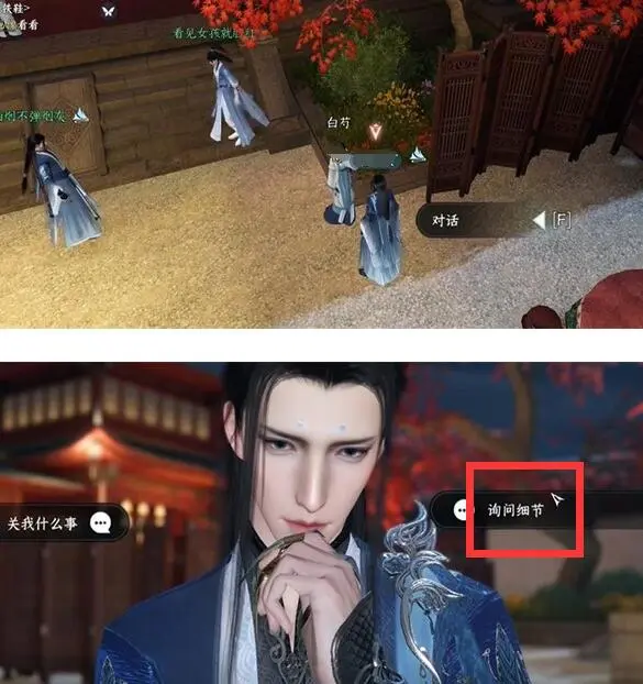 2、接着就在一边旁听它们对话,加入对话后我们选择:询问细节。