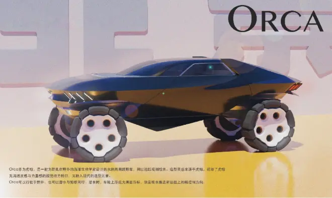 其中,荣获一等奖的的京鲸号,以鲸鱼为原型,混合多种能源作为动力,是一台海陆空通用的越野车,将未来感演绎的淋漓尽致;二等奖的虎鲸是一款为驻扎在极地的海洋生物学家设计的水陆两用电动越野车,设计野范十足,既天马行空,也理所当“燃”;与虎鲸并列二等奖的“Volcano2040”,针对特定环境的北京越野VOLCA-NO达喀尔赛车进行构想,力求延续真正的北京越野精神。另外,雨林两栖、兔子的全地形战备、城际之巅这三幅作品以突破天际的想象收获了三等奖,让我们对“明日座驾”有了更具体的想象。