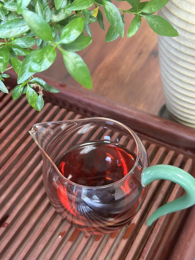 比如我用的冰岛五寨古树原料发酵的熟茶,汤色红浓透亮,如同红酒一般。不像低端熟茶出来的稀汤寡水,滋味一言难尽。