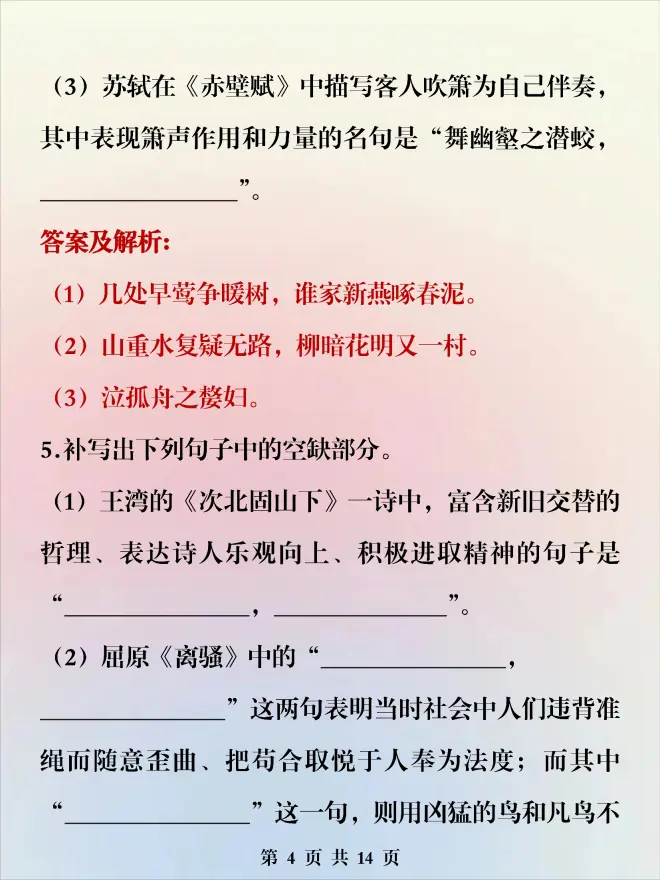 高考语文试卷中,理解性默写的考查比例逐渐增多,并且难度也加大,不再像以往的考试给出上句写出下句。