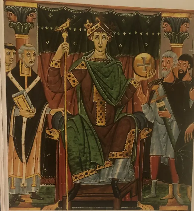 圣亨利二世(1002-1024)是巴伐利亚公爵,“强辩者”亨利二世的儿子以及亨利一世的孙子,后者不知疲倦地从他的兄弟奥托一世手中谋夺皇位。亨利二世在一场被法兰克尼亚,上洛林和巴伐利亚贵族于美因茨召开的会议中被选为国王,并在那里得到了大主教威利吉斯的加冕,于是乎他就得到了萨克森长官们的认可。然而,他还要再等十年才能得到教宗执行的受膏礼。为了让皇帝清楚这一仪式的重要性,教宗向他送去了一个苹果形状的圣球,球体分为四个部分,镶嵌着宝石,最顶端是黄金的十字架,以及加冕礼使用的衣服,其中包括一件令人印象深刻的披风,最后还有帝国的王冠和权杖。