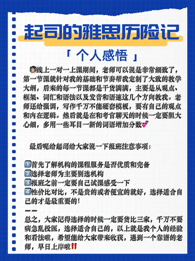 可如果真的很着急出分,然后自制力又不强的宝子,起司还是建议去找一个靠谱的雅思老师去全方面的了解雅思考试的框架和流程,然后在制定一个针对性的计划去备考⚠️这样才能实现既省钱❗️又省时间❗️还省精力❗️的这样一个找老师学习的目的‼️