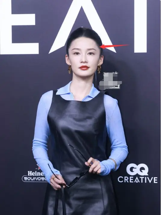 并不是所有人都有baby这样的神颜,李沁当天的造型和衣服都不太合适,黑色皮裙配蓝色T恤,高马尾扎太紧,看上去勒得慌,这更加暴露了面部的缺点。