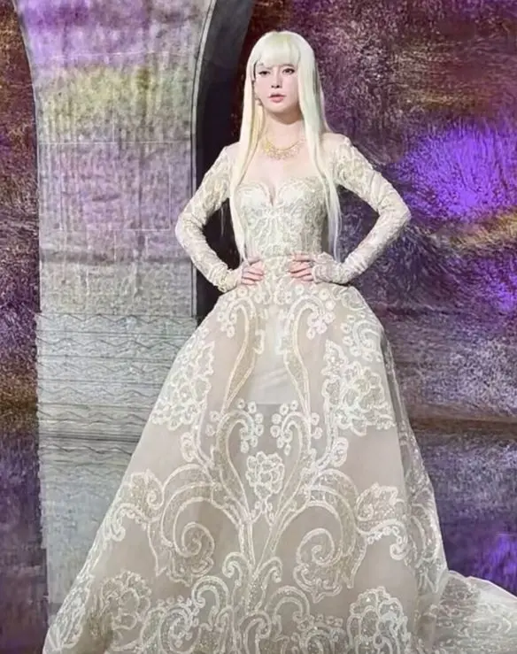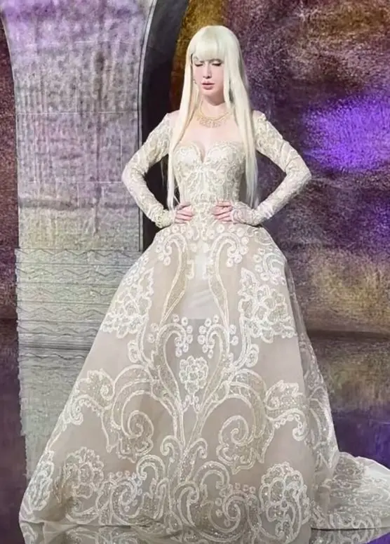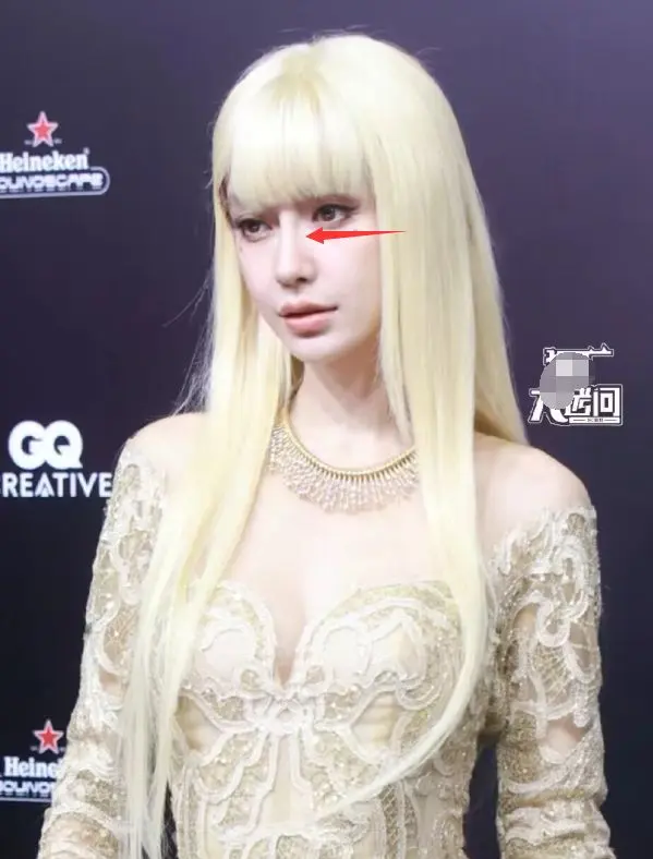 作为红毯女王的baby,每次大型活动,几乎都有她的身影,此次baby的造型十分另类,金发齐刘海造型配金色蕾丝公主裙,再加上独特的眼妆,一眼看去像一位芭比娃娃。