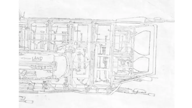 这是舰艇中部 (如下图)舰艇中部分五大功能区,第一功能区为核燃料及主反应堆组,主反应堆组由四个核聚变两个核裂变反应炉组成, 加强了区域防护,使用特种石墨,特种铜铅合金压铸为舱室壁。设单独计算机系统,使用无人化管理,燃料加注和废热交换均智能化控制。第二功能区储存放射性废料,与带辐射武器如自锐性贫铀弹头。同时设置舰主锅炉房,通过核废料余热加热供暖介质,同时配合热交换计算系统均匀分配热量,维持全舰正常运转。第三功能区为飞行甲板降落段,使用上下两具阻拦索以及回收机械臂共同组成航天器回收系统,并能进行对航天器基础维修跑道损害管理。确保能再次快速升空接敌。同时跑道右侧设置电子助降板,配合观测系统对航天器进近姿态的收集与助降计算机对飞行轨道预测,下达对航天器近进路线调整指令,以最优路线着舰。第四功能区为机炮占位,前射机炮为两挺双联装155mm高速炮,后射机炮为三具120mm口径双联快速反应炮, 用于打击近处小吨位舰艇以及来袭导弹快速拦截。第五功能区为舰载武器配套弹药舱,储存全舰各型号常规弹药,全仓储式采用无人化智能化管理,弹药可通过终端自动配送至各作战单位,且全弹药浸泡在油性稳定液中,舱室壁同时做加厚处理,提升全舰战场生存能力。