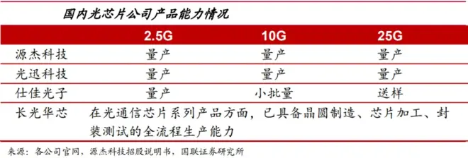 目前国内光芯片企业积极开发25G光芯片产品,源杰科技、光迅科技、仕佳光子、海信宽带等企业都有相关业务布局。其中源杰科技在其招股说明书中指出,公司的25G CWDM4/LWDM4波段DFB激光器芯片,基本优于或达到同行业先进竞品水平,能够满足下游客户的需求。