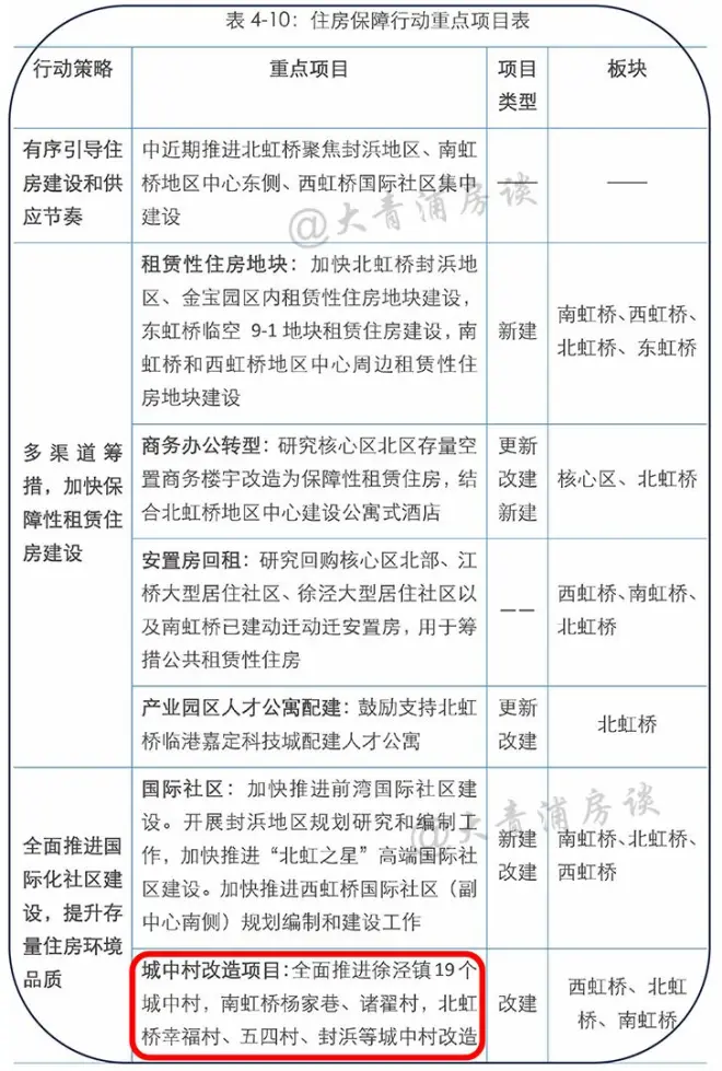 并在《住房保障行动重点项目表》中也提到了城中村改造项目:全面推进徐泾镇19个城中村,南虹桥杨家巷、诸翟村,北虹桥幸福村、五四村、封浜等城中村改造。