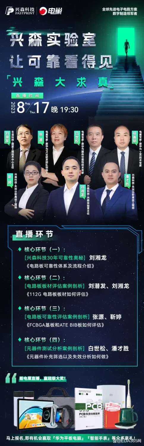 直播中,张源专家和靳婷工程师将首次在直播间公开“FCBGA基板”和IC老化测试BIB板的可靠性评估,深入兴森实验室,沉浸式告诉你该如何做好电路板可靠性评估。