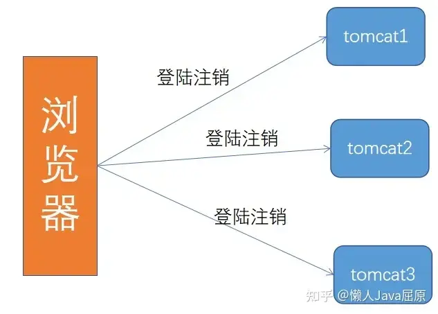 这是上一篇文章的登录模型,它在单机系统中,表现的很好很强大。但是在分布式系统中却不适用,如下图,有3台Tomcat,你在tomcat1登录了一次,但是你去tomcat2去访问的时候,因为session只存在tomcat1中,所以你又得去登录一遍,累死。