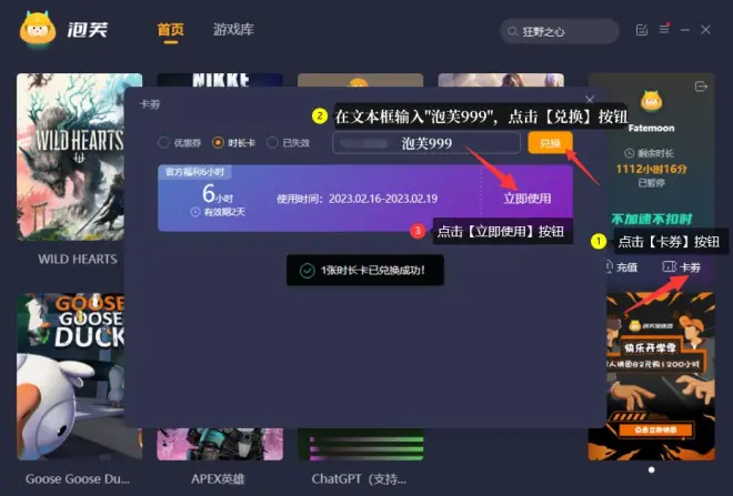 除了兑换时长活动外,泡芙加速器为大家准备了官方6h福利时长,在泡芙加速器客户端右方找到【卡券】→【时长卡】,输入“泡芙999”即可领取哦~