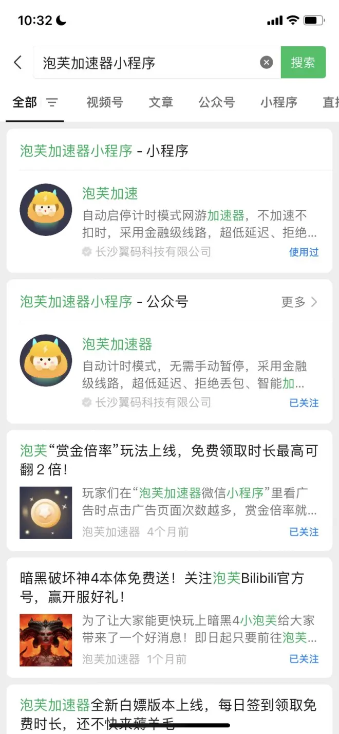 3、在微信最上方的搜索栏,搜索“泡芙加速器小程序”,点击进入小程序;