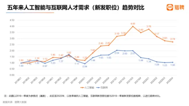 2022四季度,人工智能新发职位是2018一季度的2.74倍,而互联网仅是2018一季度的1.06倍。