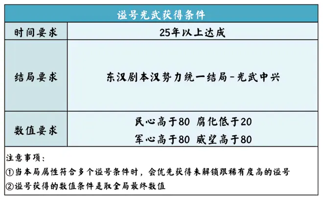 ①当本局属性符合多个谥号条件时,会优先获得未解锁跟稀有度高的谥号 ②谥号获得的数值条件是取全局最终数值