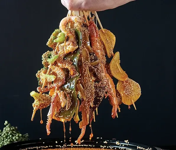 钵钵鸡:钵钵鸡是四川的传统小吃从清代流传至今,因通常都用青花大钵来装,所以叫做钵钵鸡。是用去骨的鸡肉片拿竹签串起,浸上麻辣鲜香的蘸料制作而成的,如今更是串什么的都有,海鲜蔬菜丸子都串起来浸透汤汁,麻麻辣辣十分开胃。