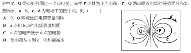 D项,该电场中,选取无穷远处电势为0,那么正电荷的区域电势为正,负电荷的区域电势为负,负电荷从a到c,即从负电荷的区域到了正电荷的区域,电势升高,电势能减小,故D正确。