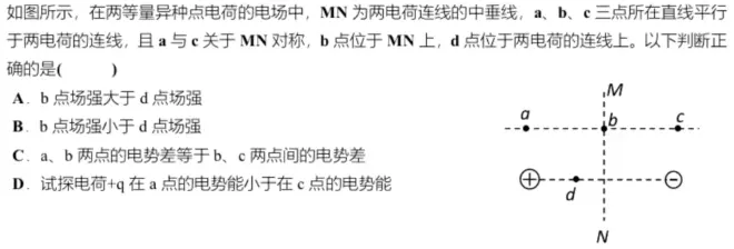 D项,因a点的电势高于c点的电势,故试探电荷+q在a点电势能大于在c点的电势能,故D错误。