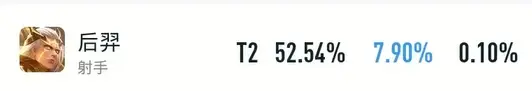 再看看顶端排位赛的数据,我们可以看到,后羿从T3降到了T2,胜率也略有提升,胜率达到了52.54%,虽然说顶端排位赛跟职业联赛不能相比。