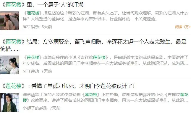 在该剧映后,关于《莲花楼》的宣传软文就在互联网上开始发酵,例如“《莲花楼》里一个属于“人”的江湖”,“《莲花楼》:看懂了单孤刀假死,才明白李莲花被设计了!”等等。同时,通过多种渠道进行口碑营销,以提高观众的满意度和口碑。《莲花楼》官方在各大媒体平台上发布观众的评价和反馈,以及一些与电影相关的话题,吸引观众的关注和参与,增加该剧的曝光度和口碑。