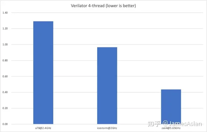 以上三款测试集对处理器的前端压力较小,仿真大规模设计的verilator则恰恰相反,海量的分支与数MB的代码足迹能够轻松压垮ICache、BTB等组件,导致巨大的性能下降。