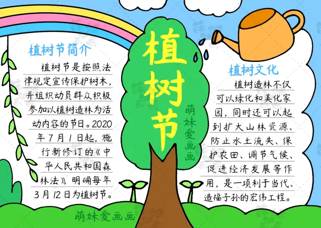 我们把大树当作报头文字框,在大树下画上小树苗,很好地呼应了植树节的主题,彩虹、云朵等元素的运用让画面更添一丝灵动的色彩。