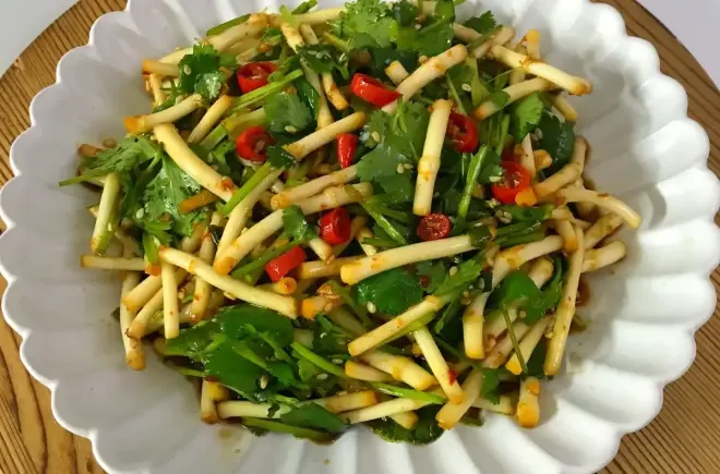 4、这个凉拌菜非常好吃,蒲公英鲜嫩清苦,所以越简单的调味越可以体现食物的本味,花椒油增加了口味的层次感。花椒和大蒜的加入也调和了寒热,