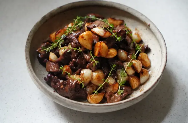 3、热锅重新倒入橄榄油,下腌制好的牛肉粒,先别翻面,等上色后再翻面,转小火,下一小块黄油、倒入煎好的蒜粒,快速翻炒,出锅前可以再撒一点点蒜粉、黑胡椒粉和盐,裹着黄油香气,出锅吧~