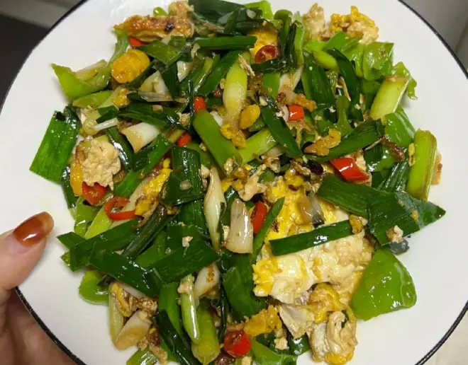 食材:两人份的食材就是四个鸡蛋、一小把蒜苗、一根青椒、三个小米辣(不能吃辣的不放)、调料是一小勺盐、一点味精、一勺豆豉、一大勺生抽。