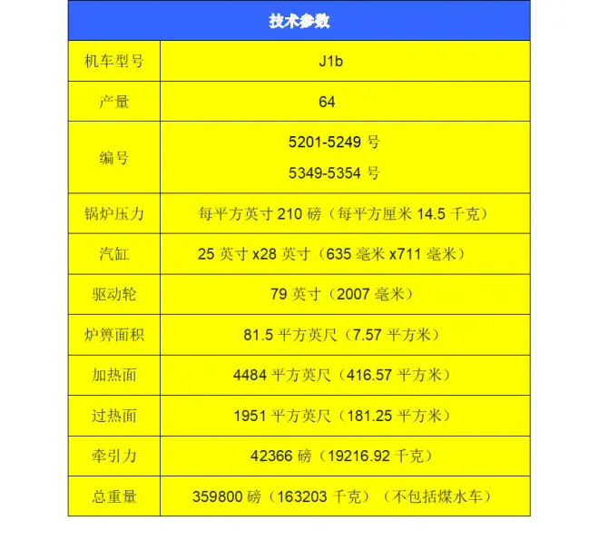 J3a型蒸汽机车能够以时速59英里/小时(95千米/小时)牵引重达1130吨重的列车,且在时速65英里/小时(104千米/小时)的情况下比J1型蒸汽机车还要多出20%的动力输出。J3a型蒸汽机车具有很高的运用强度,平均每跑185000-200000英里(297850-322000千米)(每2年)才需大修一次,其煤水车可载煤28吨,载水13600加仑,以确保机车能够长距离高强度运行。