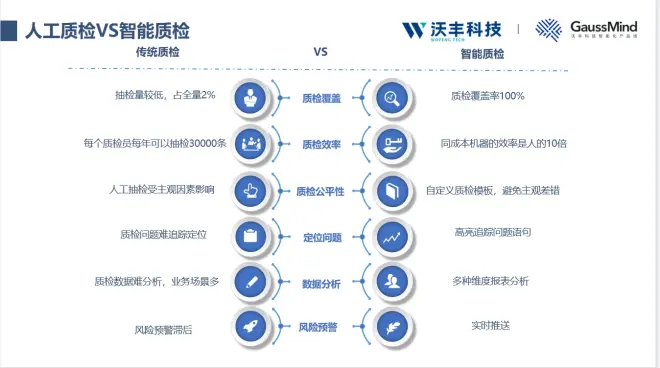 沃丰科技GaussMind智能质检依托人工智能、大数据、云计算等核心技术,通过机器进行全量质检,充分把控投诉风险,并能对客服人员的服务进行评分、辅助考核,优化绩效管理。