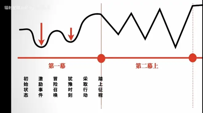 首先是一个初始状态,然后激励事件出来之后,然后有一个冒险去召唤我们的主角,我们的主角会受到一点阻碍和一点犹豫,但是他最终还是决定踏上征程,走向了这条路。